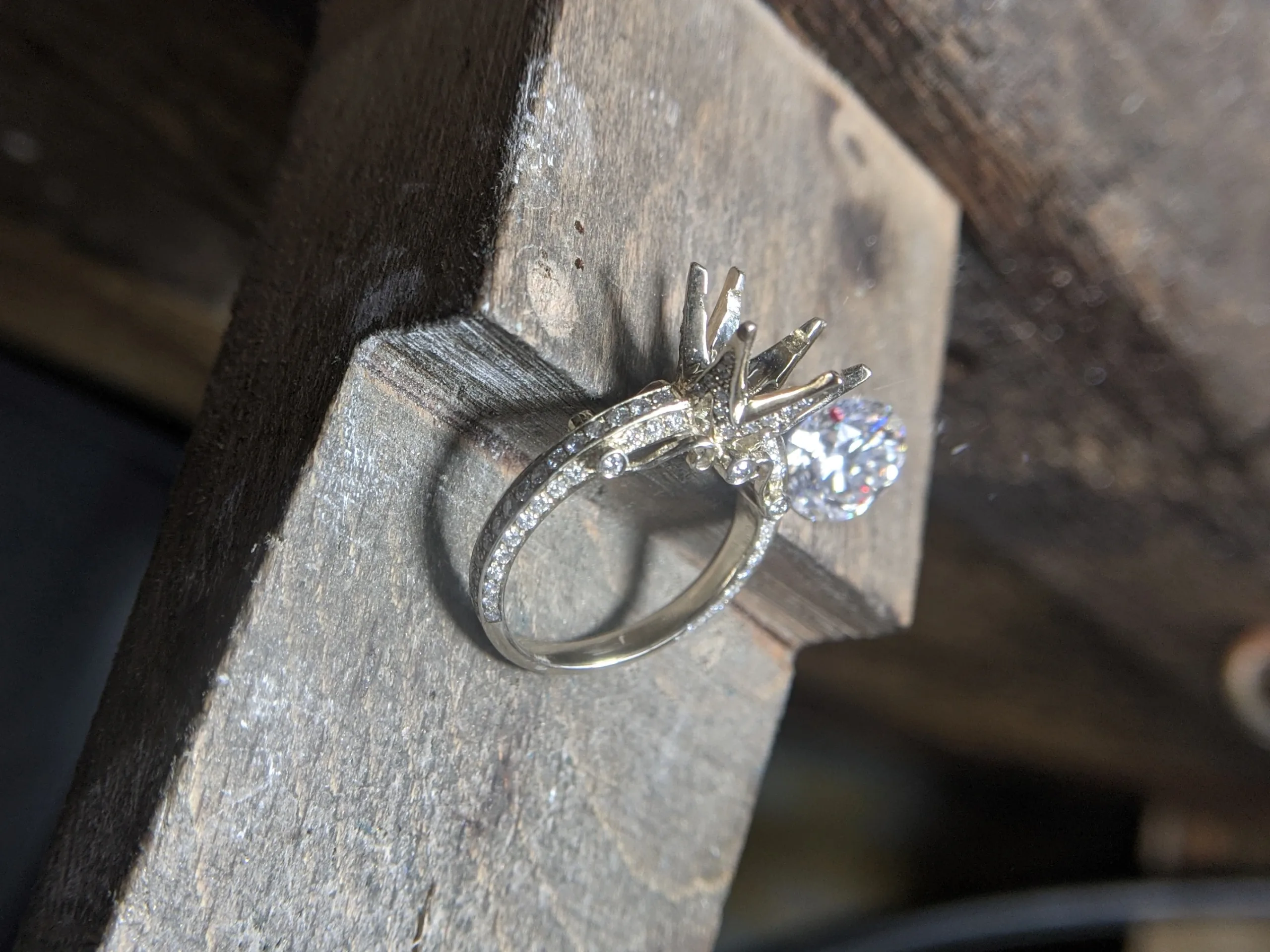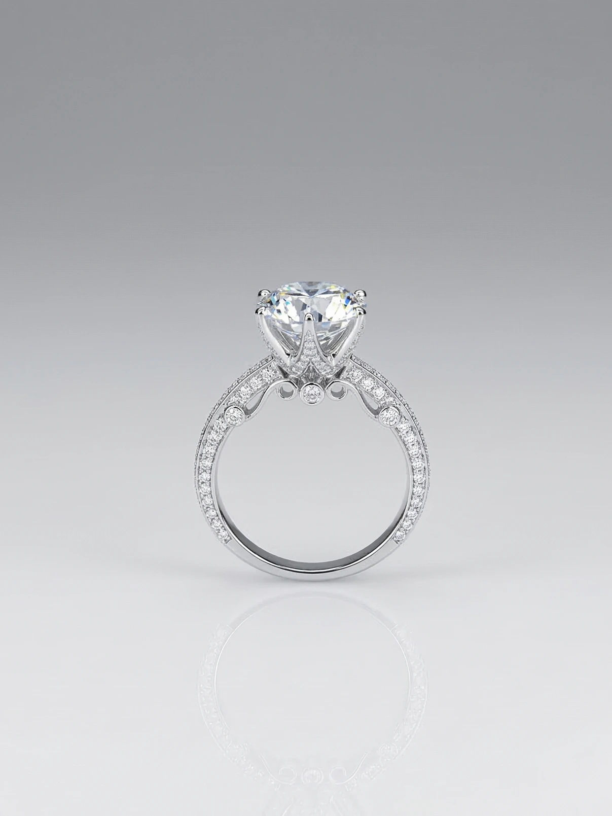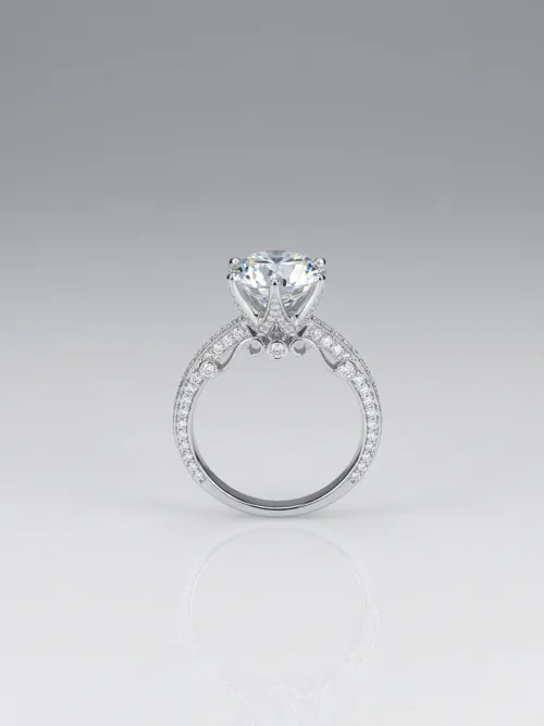 Return To Shop這款鑽石戒指展現了極致的優雅與奢華。整枚戒指採用全鑽鑲嵌,光芒耀眼。中心的大顆鑽石採用圓形明亮式切割,在四爪鑲嵌下更顯璀璨。戒圈和戒託均鑲滿小鑽,精緻且富有層次感。